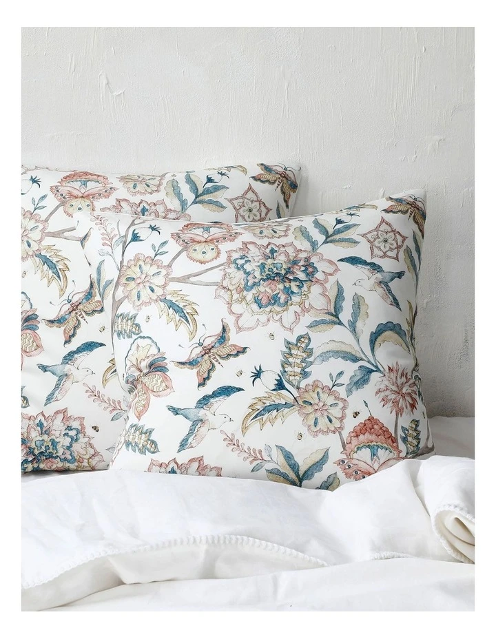 Printed digitally on a 300 thread cotton sateen against a crisp white ground, this pretty yet subtle floral set reverses to a plain-dyed white and looks even more inviting adorned with a pair of its coordinating European pillowcases.
