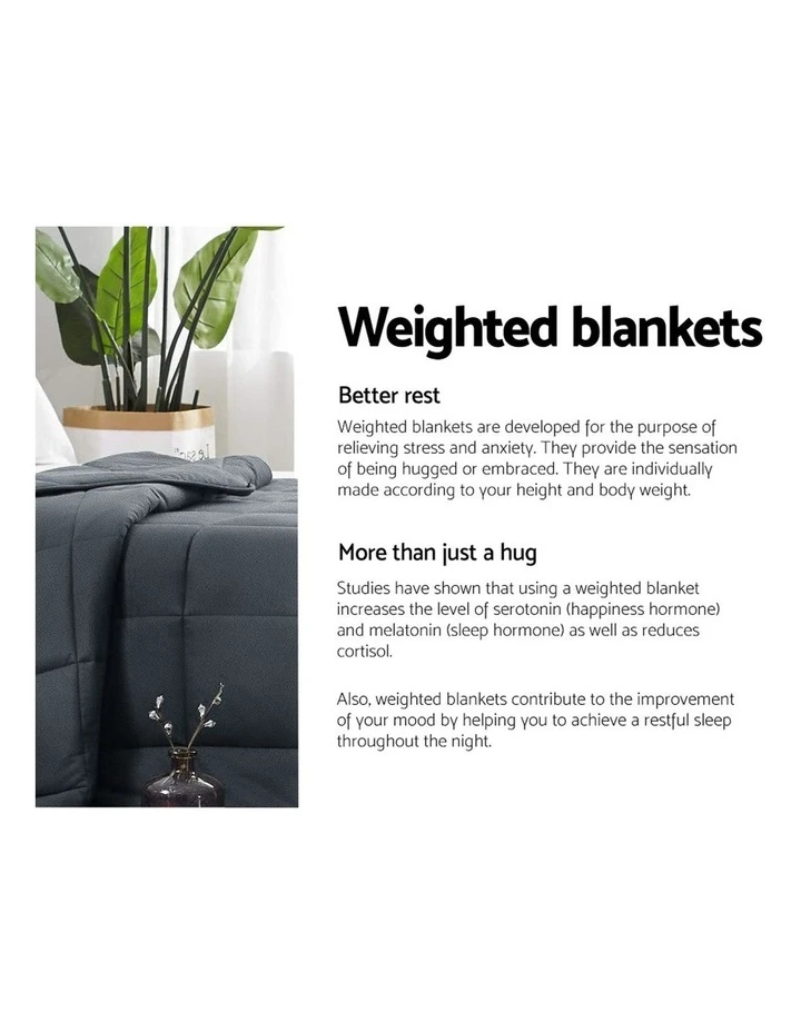 The science behind better sleep lies with a Giselle Bedding Weighted Blanket. It uses the therapeutic power of Deep Touch Pressure Simulation (DTPS) to stimulate pressure points throughout the body, thereby contributing to enhanced sleep, mood and relaxation. Our weighted blanket is engineered to be between 8% and 15% of your body weight to relax the nervous system by simulating the feeling of being hugged or held. This boosts serotonin and melatonin levels and decreases cortisol levels improving your heart rate and blood pressure. In short, you get healthier sleep and awake feeling refershed and re-invigorated. Made of a plush and microfibre mix for the top and 100% microfibre for the bottom, the weighted blanket is filled with polyester and glass beads to create the right amount of pressure for a soothing hugging sensation. The weighted blanklet is also close-fitting and conforms to your body shape and adapts to any sleeping posture easily. Not least, its excellent leak-proof stitching and 5-layer comfort ensures that the weighted blanket is ever so durable and comfortable with every use. The weighted blanket is machine washable for total convenience.
