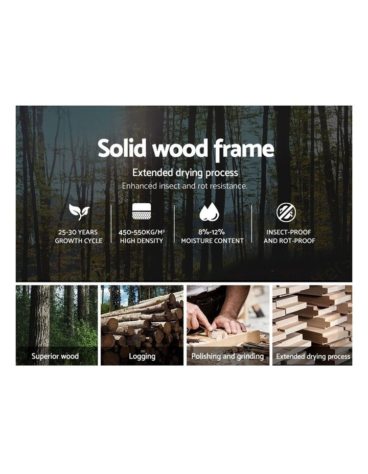 On the outside, this bed frame looks like just any other quality bed frame. Beautifully padded with generous foam and covered in Fabric. Strong steel frame with high grade steel centre rails, heavy duty stand bars and arched slat base. Large and comfortable headboard.