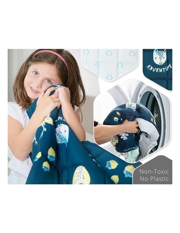 It looks like fun and feels like a hug. Our navy blue adventure blanket is perfect for the adventurous child. Featuring our cute yellow deer and cheeky fox on a navy blue background, your child will love this calming and fun design. This blanket has a contrasting light blue reverse side with antler pattern to complement your child’s bedroom. Designed to hug the contours of your childs body, weight is applied using odour free, glass microbeads which have been securely stitched into, and evenly distributed across each quilted pocket.