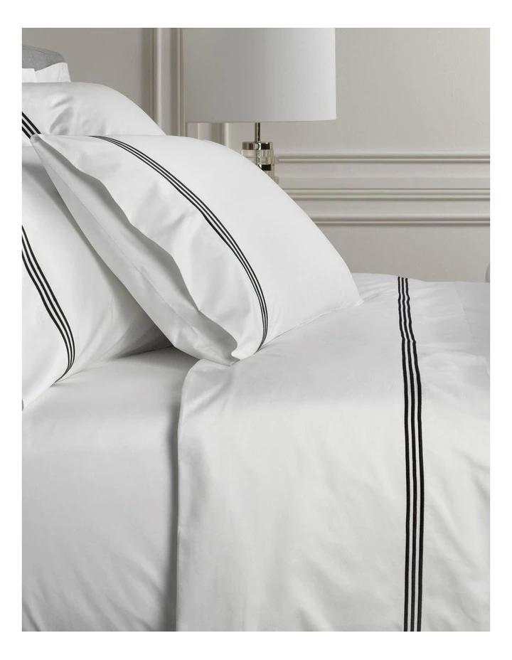 Palais brilliant white 1200 thread count, spun from superior long staple fibres, creates a lustrous sateen weave for luxuriously soft, next-to-skin comfort. The generous borders are trimmed with Palais trademark triple stitched embroidery, available in a range of designer colours. Create a stunning bed of tailored simplicity with Palais.