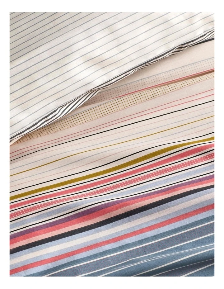 Inspired by vintage textiles, Sheridan’s Raye quilt cover set refreshes the classic stripe for a youthful look. Contrasting colours and sizes make a visual impact, small scale spot patterns add to the juxtaposition. Cotton sateen, small scale pinstripes feature on the reverse. – 100% printed cotton sateen – Multi- coloured, multi- sized stripes – Contrast printed reverse, in small scale pinstripe – Inspired by vintage textiles – Includes quilt cover and standard pillowcase/s