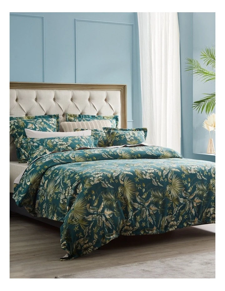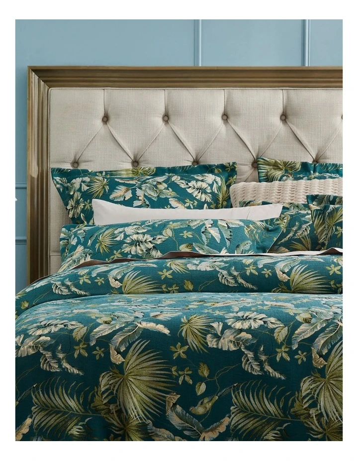 Malucca Forest captures the mood of tropical days and balmy nights. Layers of lush foliage in tonal greens is punctuated with pops of gold creating an oasis in the bedroom. Heighten the look with Malucca’s matching European pillowcases and square cushion.