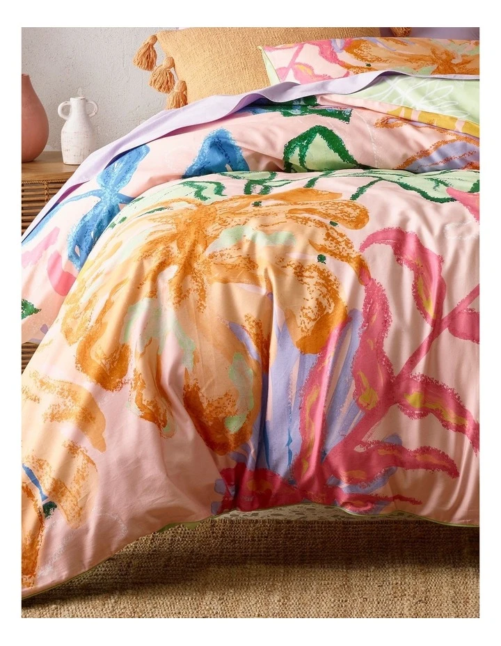 Inspired by the desert oasis of Palm Springs, this stunning large-scale print features hand painted abstract motifs in a vibrant summer palette. Printed on a super soft cotton sateen base with contrast cord piping and a printed reverse, our Caliente quilt cover set is a joyful addition to any bedroom.