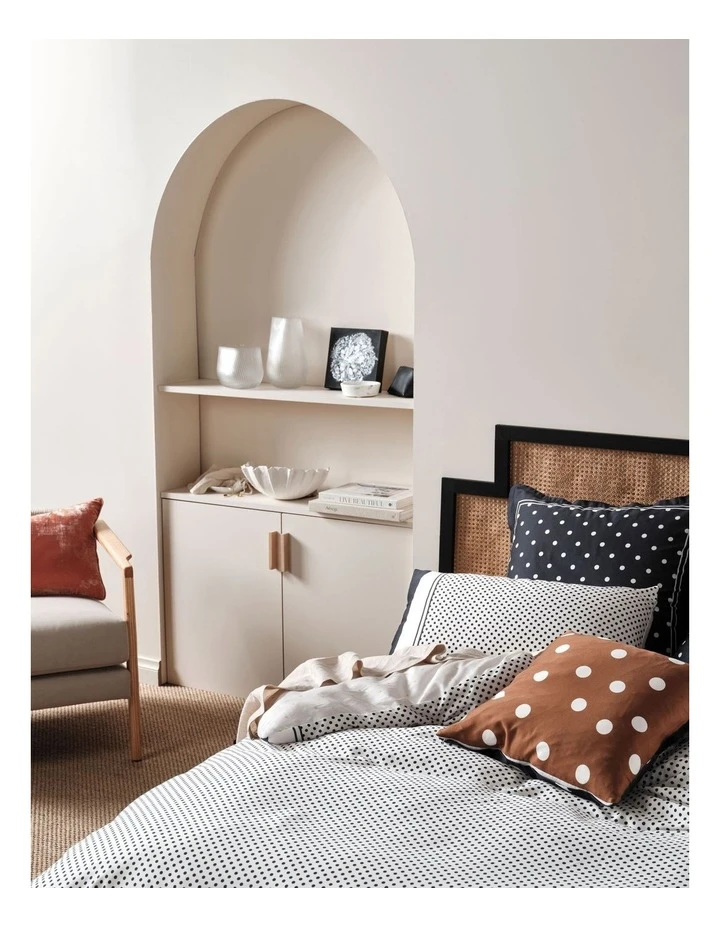 Inspired by scarf prints of the eighties, Vivienne’s reinvented polka dot will look nothing short of sensational paired with its matching tailored European pillowcases and printed reversible cushion with larger-scale spots for contrast.