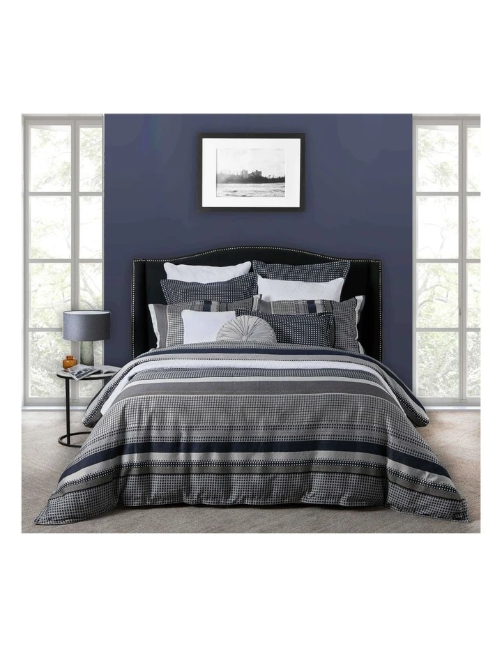 London Ink is a sophisticated geometric thatseamlessly integrates pattern into the bedroom. A series of horizontal stripesalternate between checks and plains, in a timeless navy and silver palette.Edges are elegantly tailored with a self-flange and cord piping.