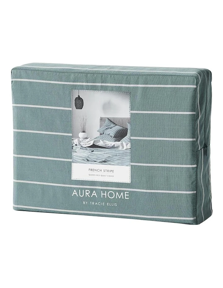 Designed in Melbourne, Aura’s French Stripe cotton percale bedlinen collection in Atlantic is all about mindful design and eco-friendly interiors.