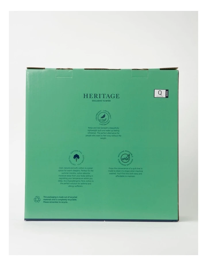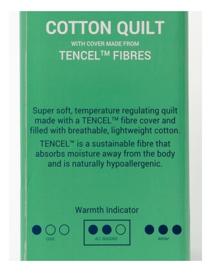 Our Heritage TENCEL Lyocell fibres Cotton Quilt is a lightweight TENCEL Lyocell fibresquilt with cotton fill. Crafted using TENCEL Lyocell fibres, a super soft eco -friendly fibre this quilt is ideal for warmer climates, and offers breathability. It is naturally hypoallergenic and temperature regulating.