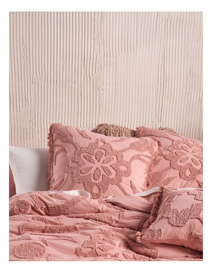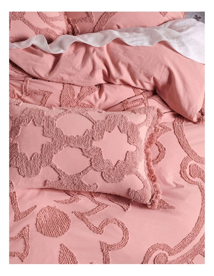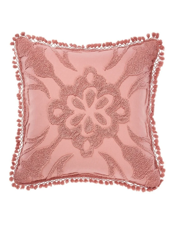 Bring a touch of Portugal to your bedroom with Rapallo, which features alluring tile motifs in a beautifully textural, cotton-looped chenille in a romantic shade of blossom-pink. Complete with tasseled edges for worldly nostalgia, this set is a heavenly dream paired with its coordinating European pillowcases and cushion, also with stylish matching tassels.