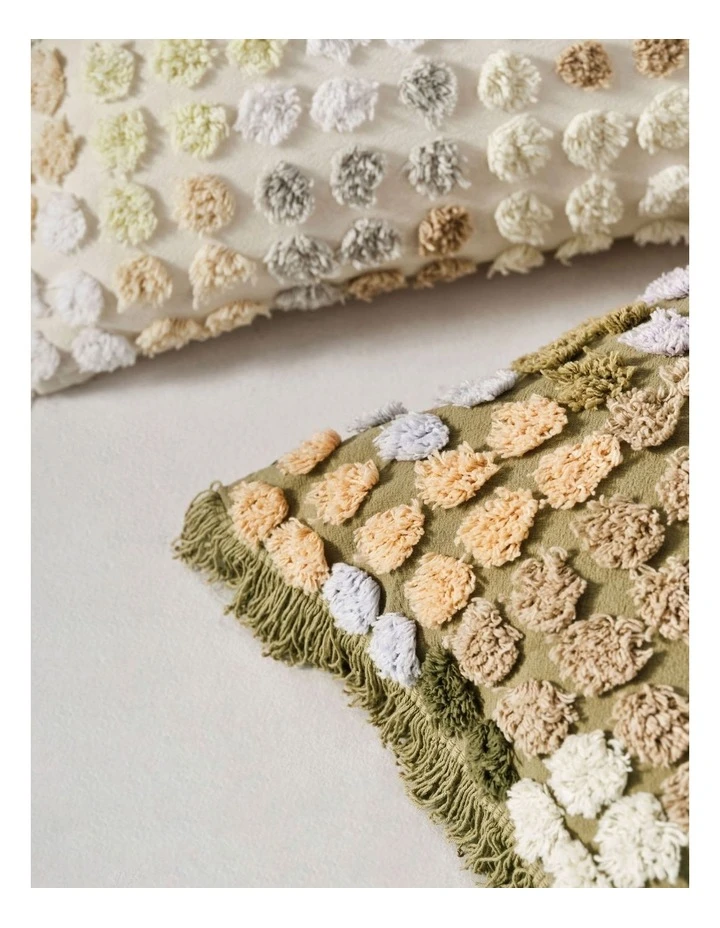 A total "it" accessory, fluffy, multi-coloured spots adorn this marvellously lively cushion, which features dominant fern hues throughout.