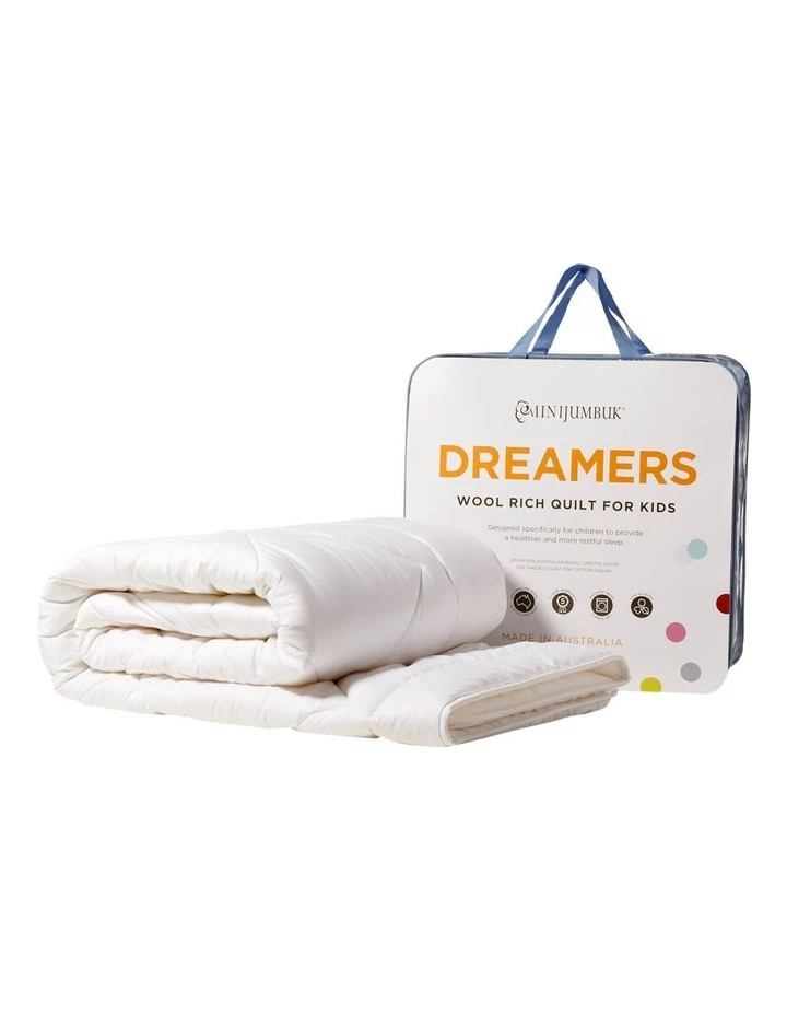 Weve designed our DREAMERS Quilt with a mid-weight fill of 325gsm and pure cotton casing to gently balance your childs temperature throughout the night. Weve also added just the right amount of spiral man-made fibre to enhance the loft and made this quilt even easier to wash, without sacrificing the natural benefits of wool.