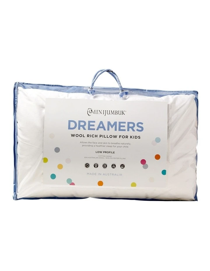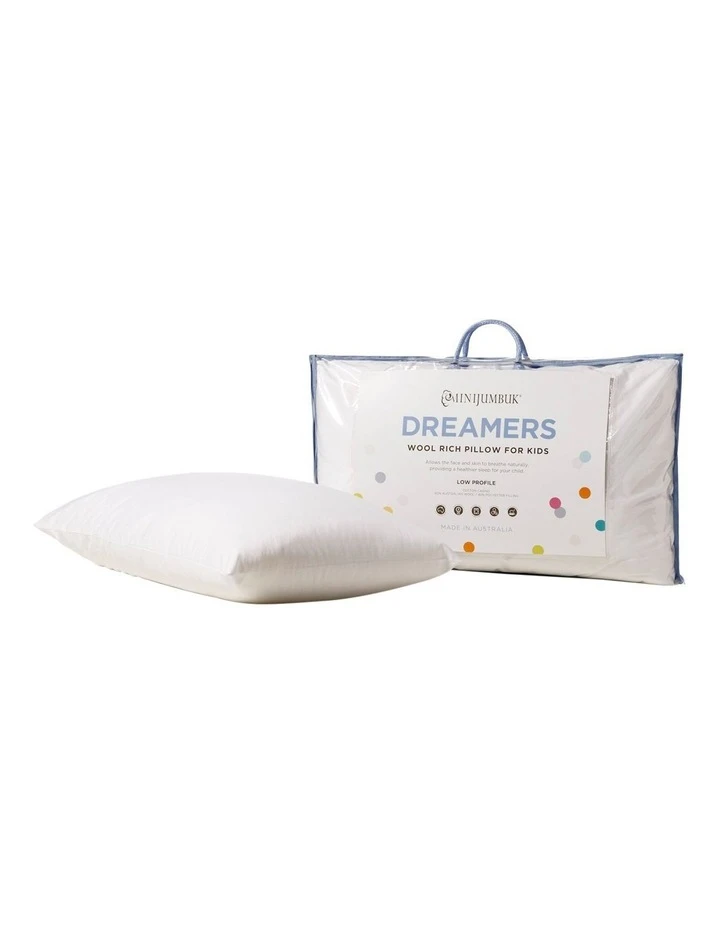 Low profile designed for kids.The wool rich filling in the DREAMERS pillow is 350gsm, ideally suited for young children to give gentle support and comfort. The cotton casing keeps the filling in and the dust out. It also allows the skin to breathe, keeping your childs face and head comfortable and dry ensuring a healthy nights sleep.