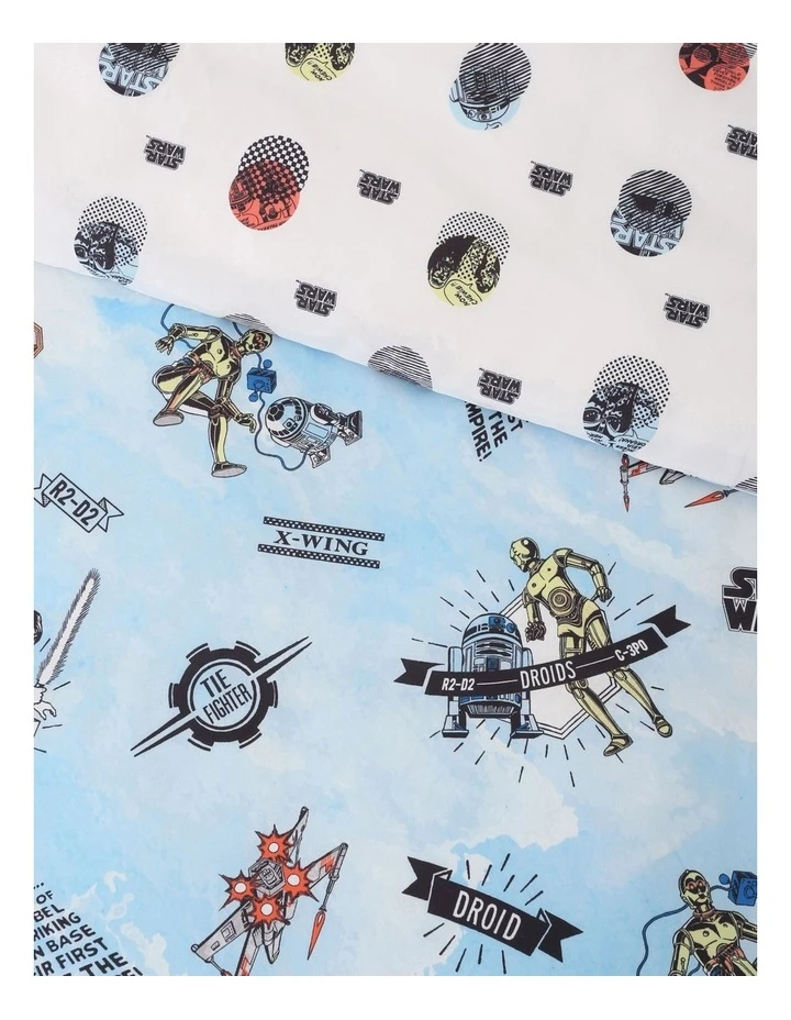 You’ll be dreaming away to another galaxy with this amazing quilt cover set from the world of Star Wars. With an exclusive design featuring the classic Star Wars icons, this 100% Cotton quilt cover set is easy care and perfect for Star Wars fans young and old. Available in Single, Double and Queen bed sizes.