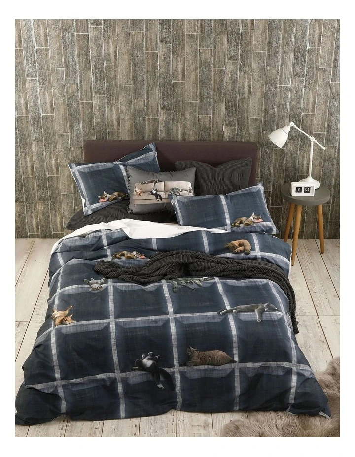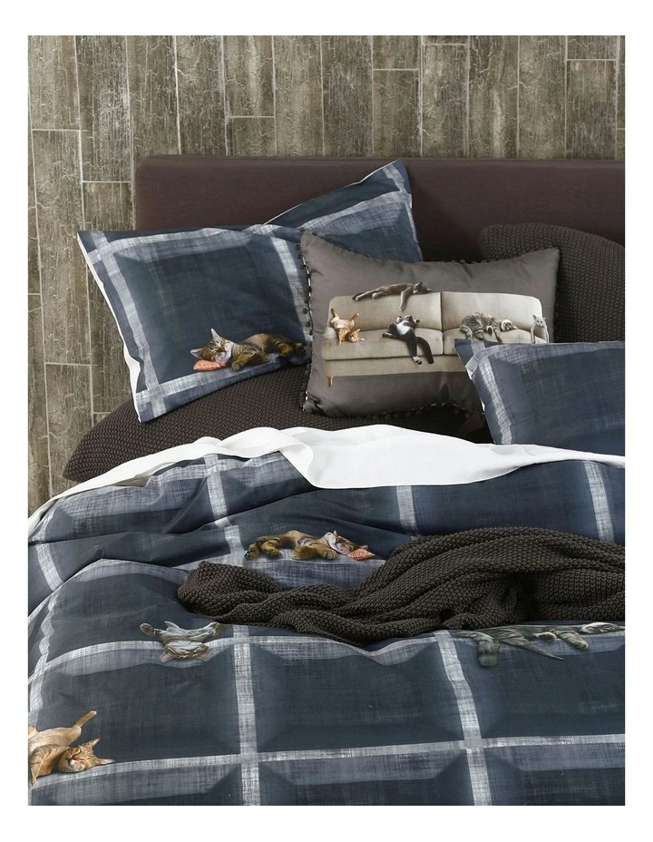 All curled up for a good night’s sleep, Cubby’s super-charming digital print enjoys cats and kittens relaxing in their cubbies. Made from 250 thread cotton percale, this blue and grey geometric will create some feline fun and looks even more thrilling paired with its coordinating cushion.