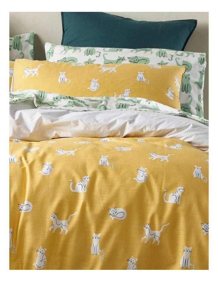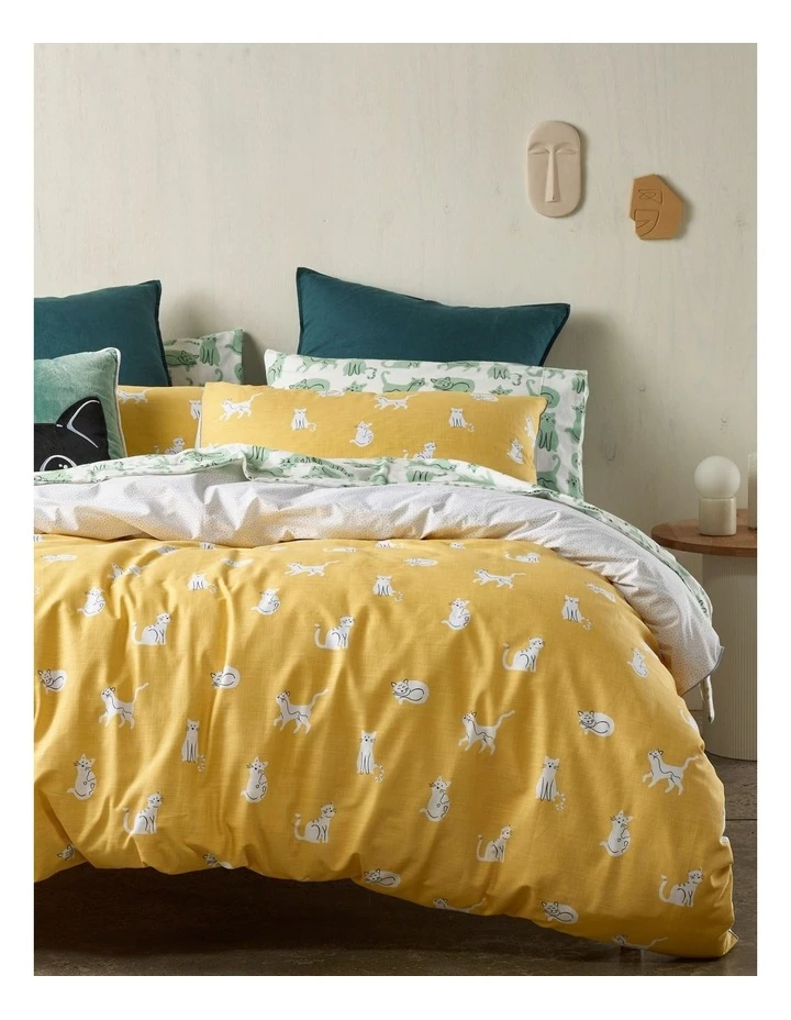 Introducing our Rupert Cat quilt cover set. This quilt cover set features a design of friendly felines hand-painted by our in house design team. With a yellow base and white reverse this quilt cover is crafted from cotton for breathability and comfort. Finished with contrast colour cord pipe detailing the Rupert Cat is perfect for the cat lovers out there. Quilt Cover Set Includes: -1 Quilt Cover -2 Standard Pillowcases (1 with single bed sizing)