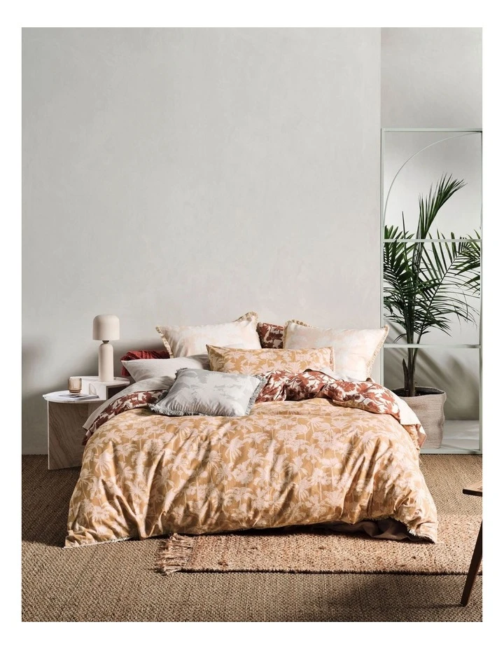 A sweet, stylish micro palm scene, the beauty of Tourelles is its reversible design from a paprika to a chai-blush ground – perfect to accomodate your mood and style. This set, which is printed on a crisp cotton percale and trimmed with fringing, looks outstanding paired with its larger scale print European pillowcases and matching cushions, all with matching trims.